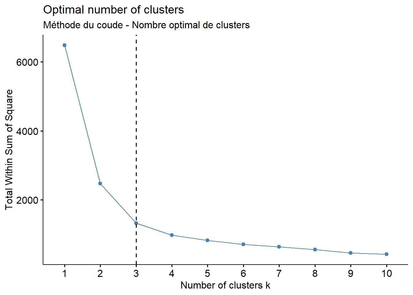 labs(subtitle = "Méthode du coude - Nombre optimal de clusters") Warning: The `size` argument of `element_line()` is deprecated as of ggplot2 3.4.0.