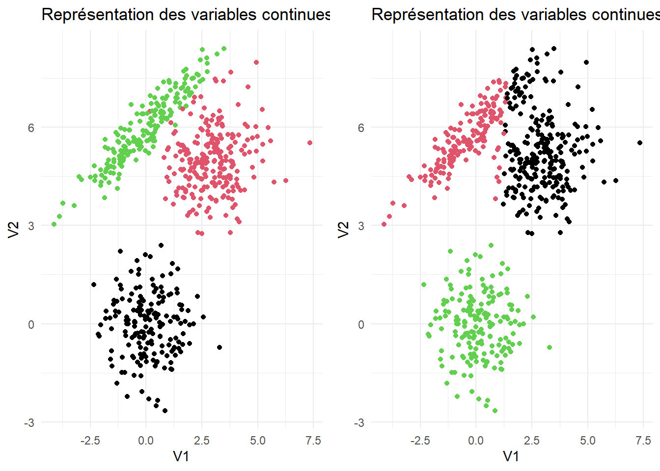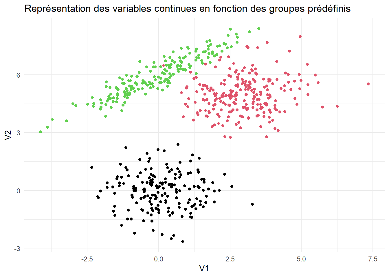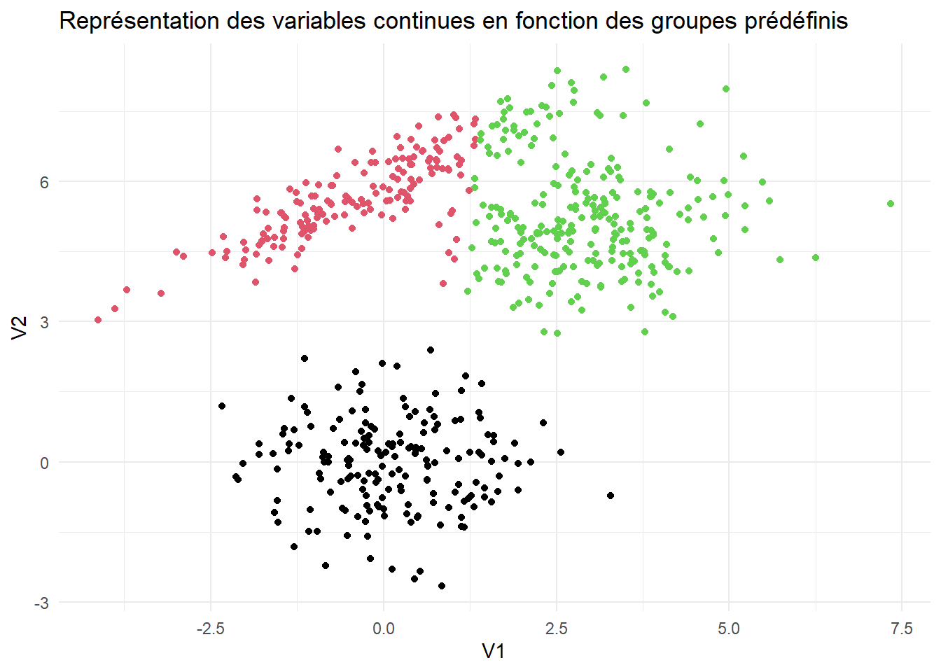 as_tibble(X) %>% ggplot(aes(x = V1, y=V2)) + geom_point(color = cl) + theme_minimal() + ggtitle("Représentation des variables continues en fonction des groupes prédéfinis") -> graph1