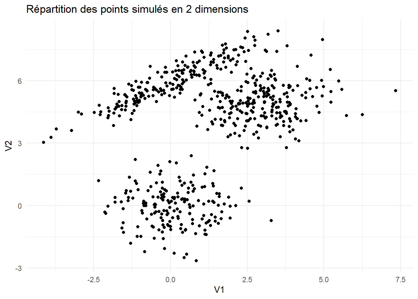 geom_point() + theme_minimal() + ggtitle("Répartition des points simulés en 2 dimensions")