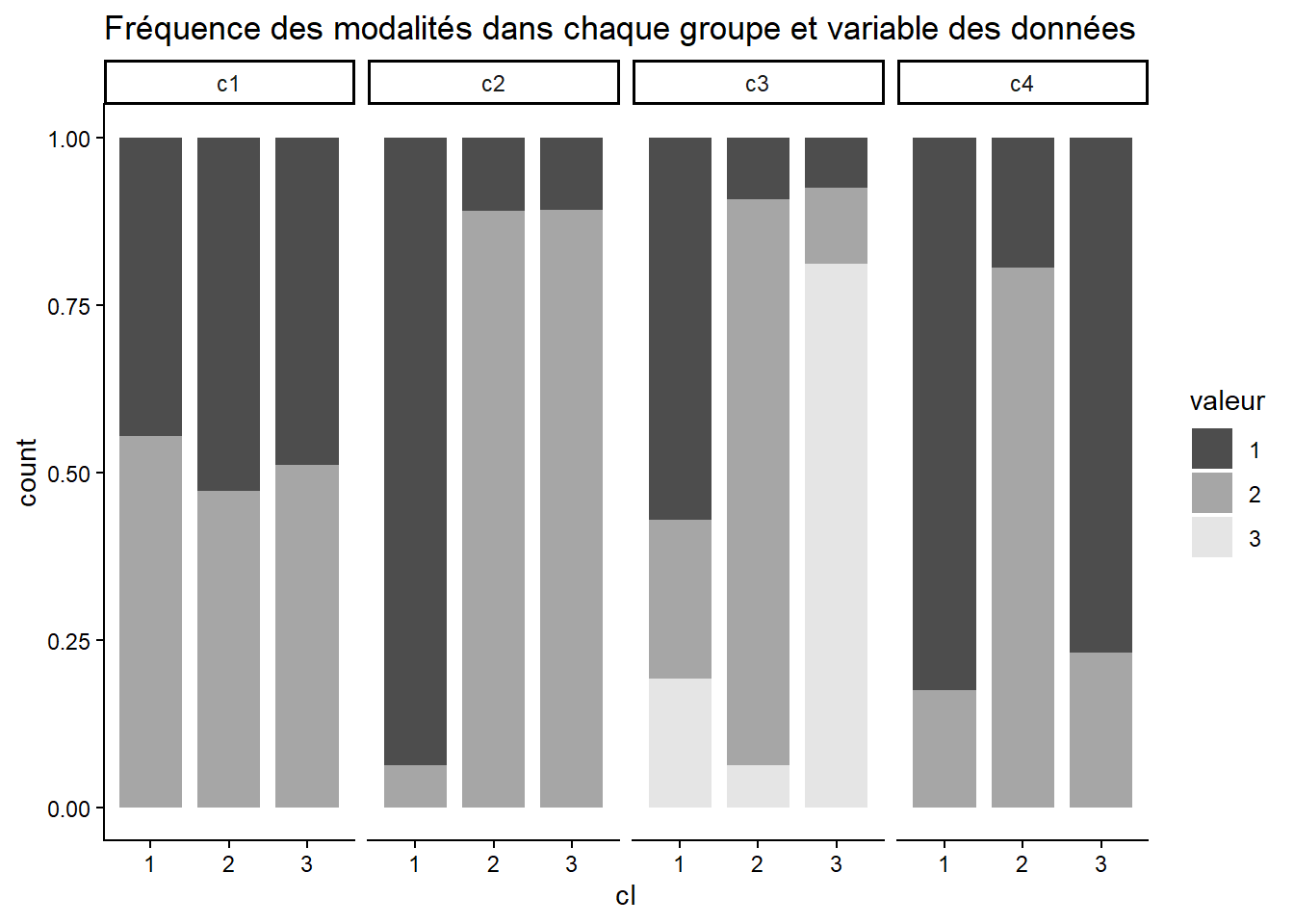 ggtitle("Fréquence des modalités dans chaque groupe et variable des données")